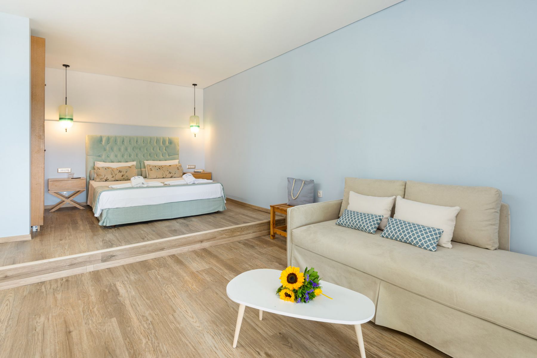 Hotel's Junior Suite Garden Sea View consist of 1 Queen bed & 2 single beds (parts of a sofa with premium mattresses, air conditioning, satellite channels and TV with modern LED technology 43" , fridge , electric kettle with coffee/tea equipment, safe box, telephone, wireless internet connection over wifi , hair dryer, toiletries and a private bathroom with shower.