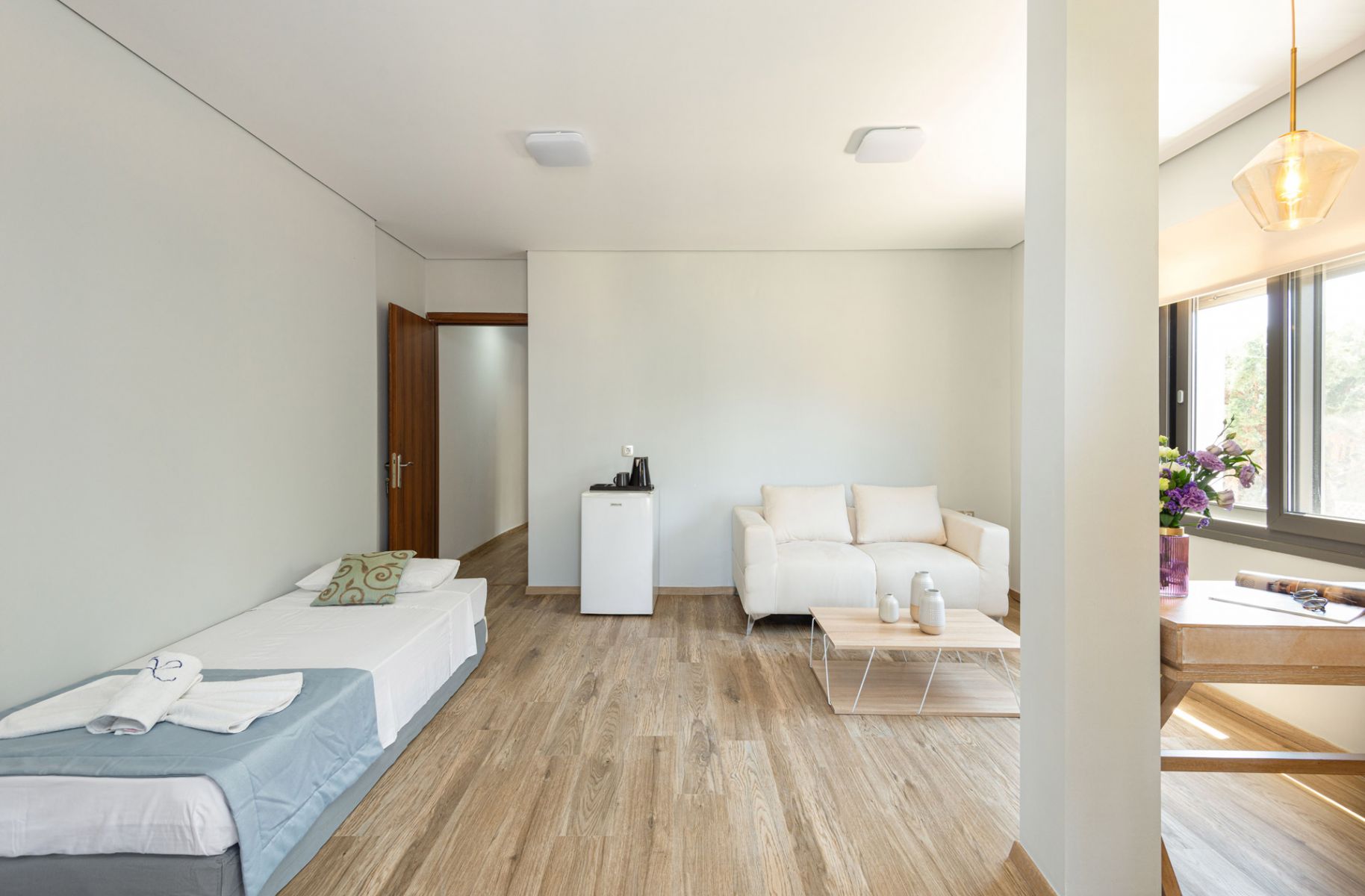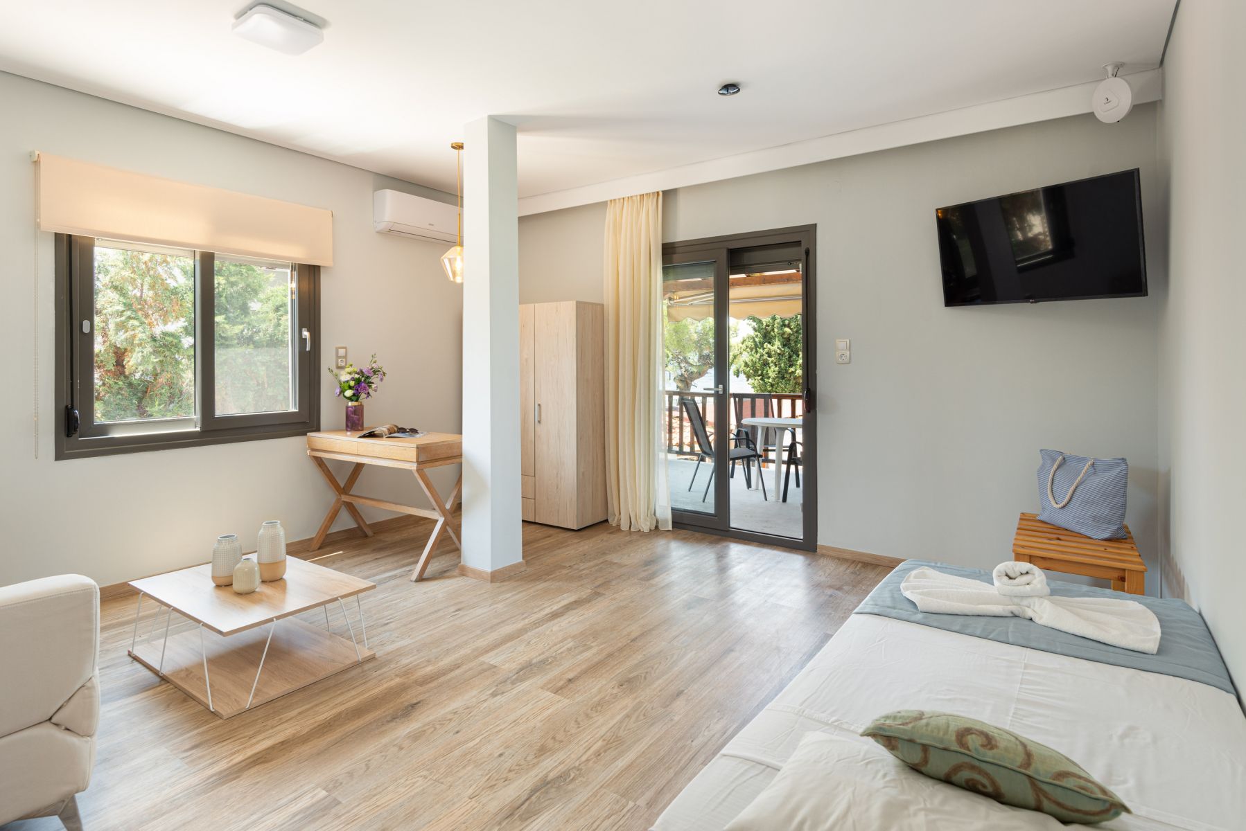 Moreover, from the private balcony or terrace, you can enjoy the view of the blue waters of Toroneos Gulf. It is the right choice for families and groups of friends who want to relax and have an enjoyable stay by experiencing the unforgettable experiences offered by our region.
