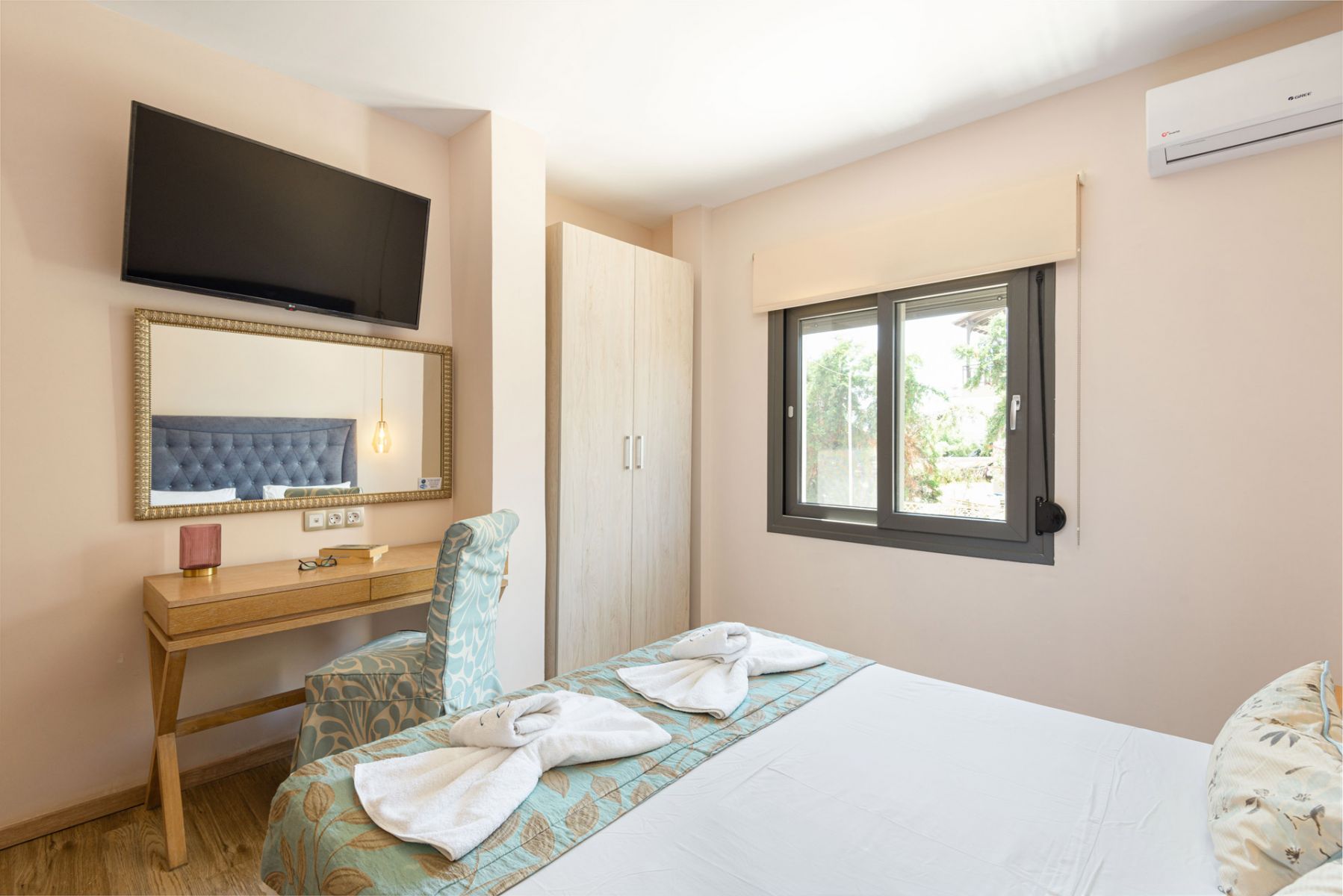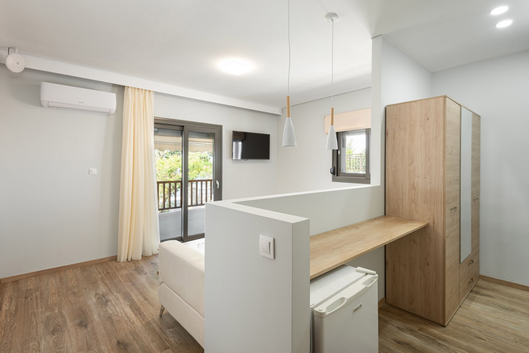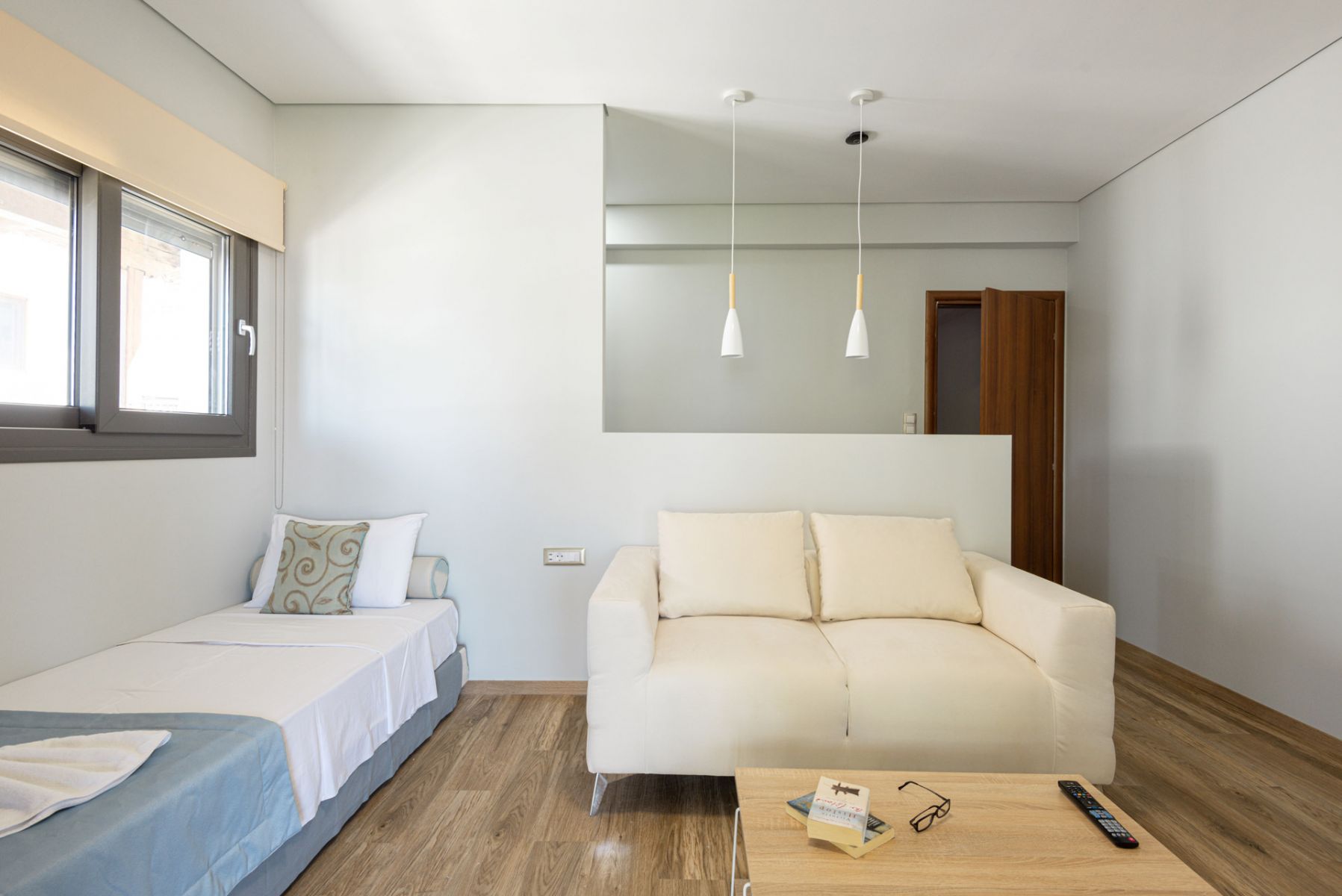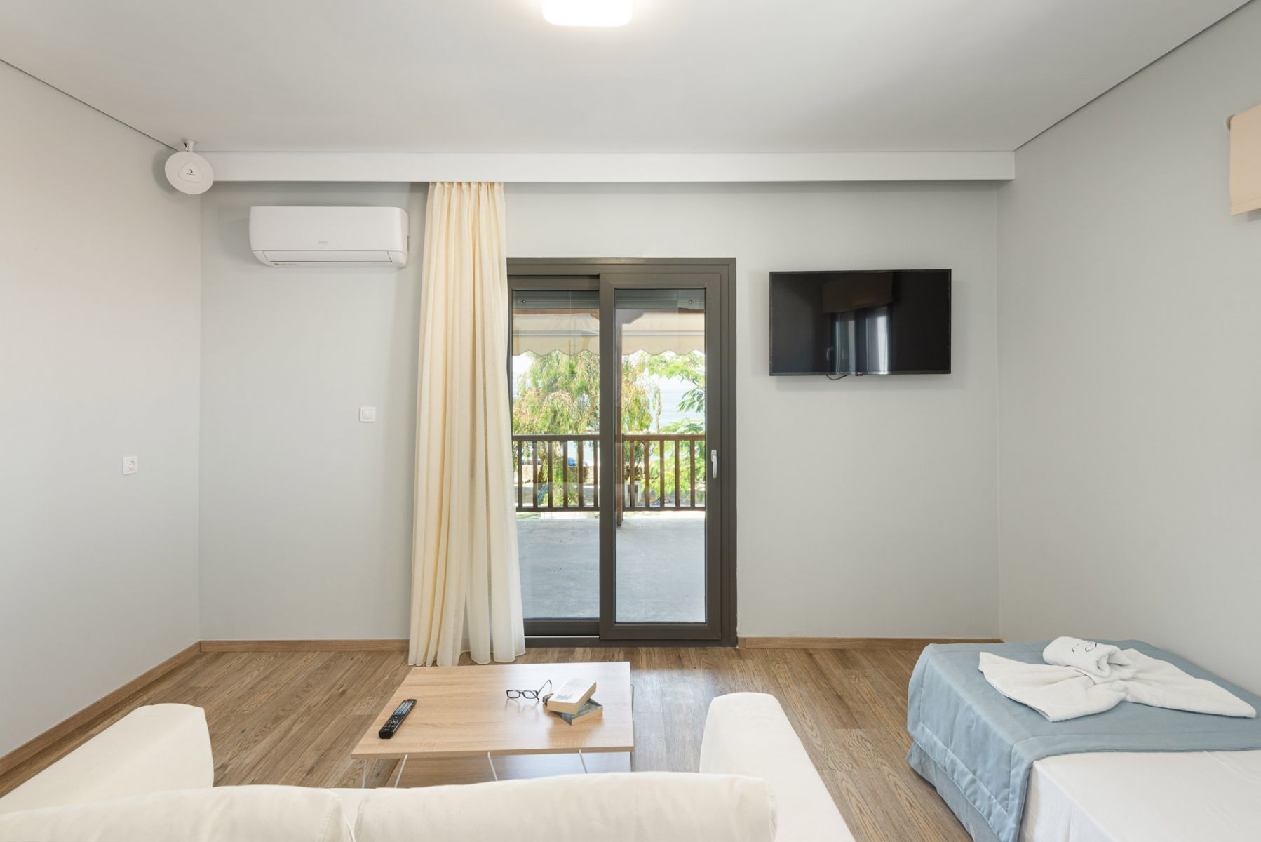 The hotel's Family Apartments with sea view consist of 1 Queen double bed, 1 single bed, 1 sofa bed (160cm x 200cm) and can accommodate up to 5 people. It is functionally designed and includes , refrigerator and electric kettle, 2 x air conditioning, satellite TV and 2 modern LED TV 43 ", safe, telephone, wireless internet connection via wifi, hair dryer, toiletries and a private bathroom with shower.