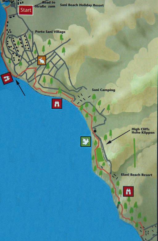 The start for this walk is about 100m north of the Portes Palace Hotel in Potidea. A road leads down to the beach in about 400m. On reaching the beach road turn right for about 100m and then left across the dunes to meet a sandy track. turn left onto this track and follow it northwards until you see the lake on your left. The size of the lake varies according to the season. Look for a track to the left which takes you nearer to the lake and follow this track northwards with reeds and the lake on your left.