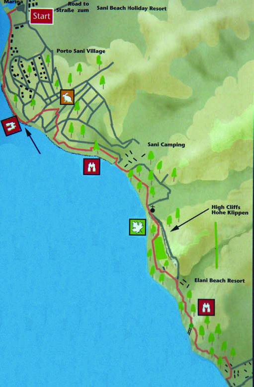This walk can be started from either end but the description here is from Porto Sani Village to Siviri. It will be necessary to organize transport for your return, unless you intend to retrace your Steps (20km). The path follows a well-marked woodland path, which meanders along the cliff tops between Sani Beach Holiday Resort and Siviri ; ---->Continue