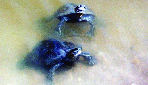 After 350m a junction is reached at a high point. Once more the now familiar signs mark the way and we turn right, gradually descending to the north. In a further 250m the track splits three ways. Turn sharp left here as the route first descends to the south and then turns west again, gradually descending towards the floor of the deep, tree filled gorge to the right.To the left are high sandstone cliffs and to the right very large pine trees, many covered with dense ivy. In a short distance the track drops steeply as it curves right to reach the valley floor adjacent to the turtle pond. Here there are picnic tables, a drinking water fountain, and seats from which to view the turtles. To return to Polychrono continue past the pond on the same forest track to reach a junction in a short distance.